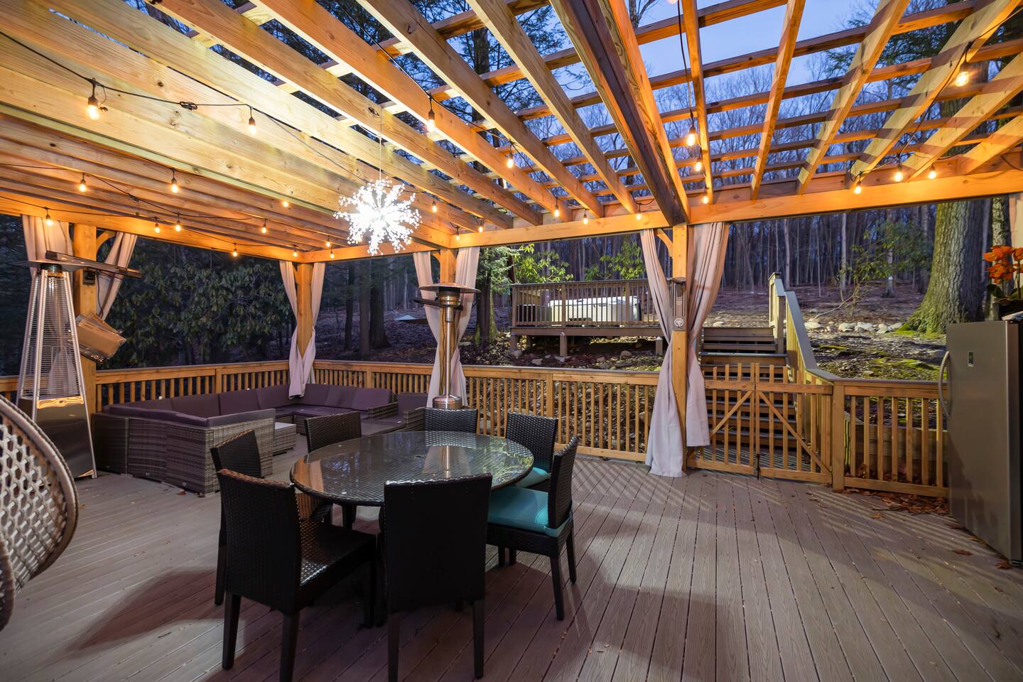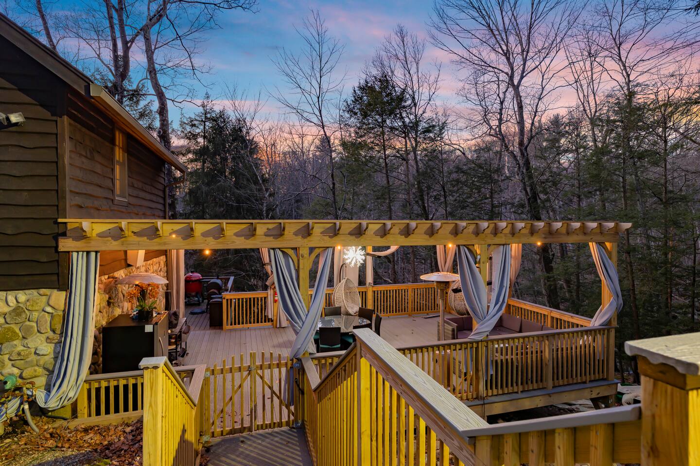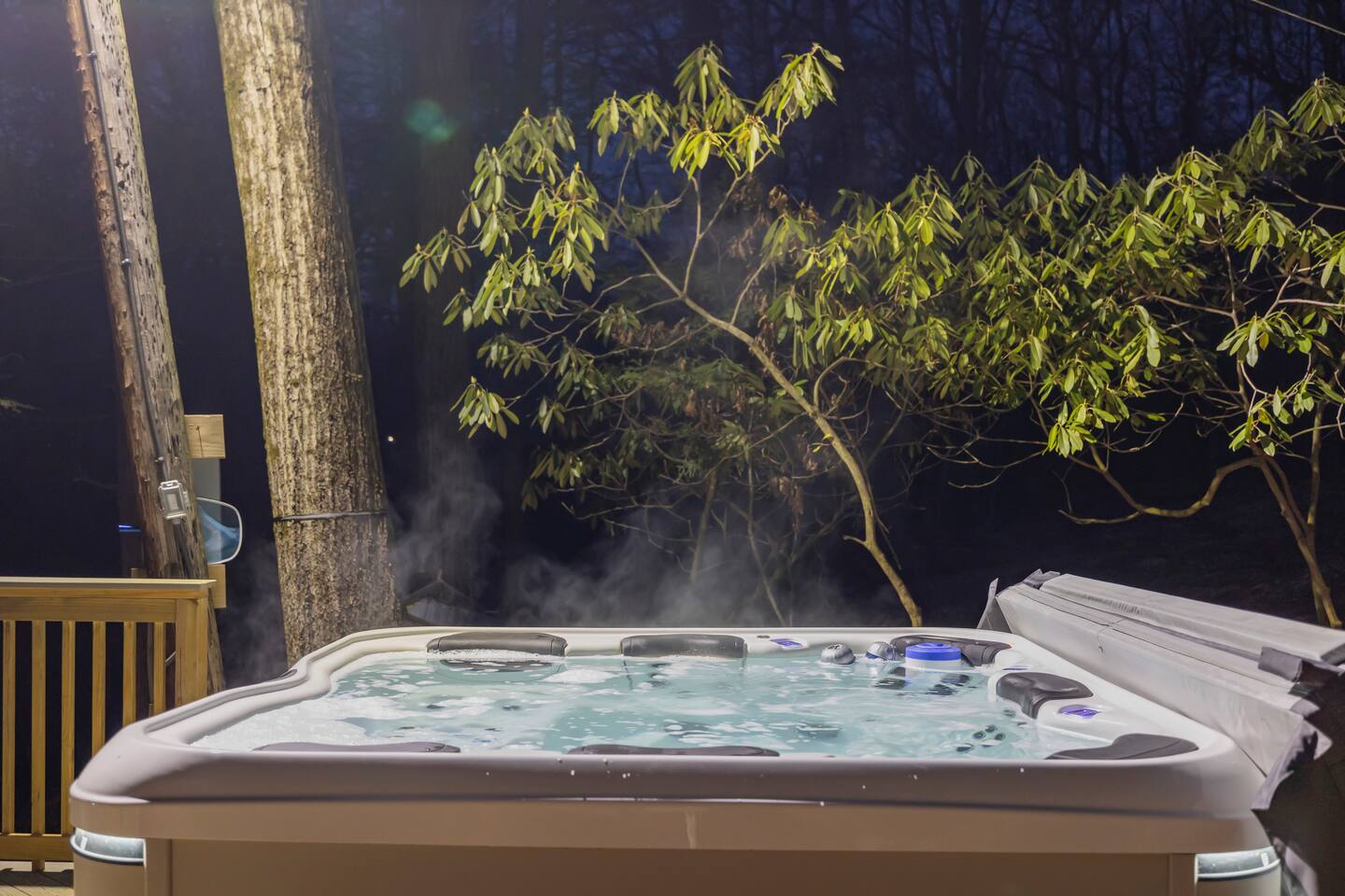 Our Cabin has the following exciting amenities: - Year-round Hot Tub ♨️ - In-ground trampoline! 🦘 - Outdoor Pizza Oven 🍕 - Komodo Joe Grill/Smoker🔥 - Cozy indoor fireplace ☕ - Outdoor fire pit 🪵 - 16-seat indoor dining area - Kids Toys - Eiruv & Nearby Shul + Kosher food warmer